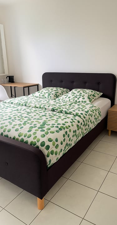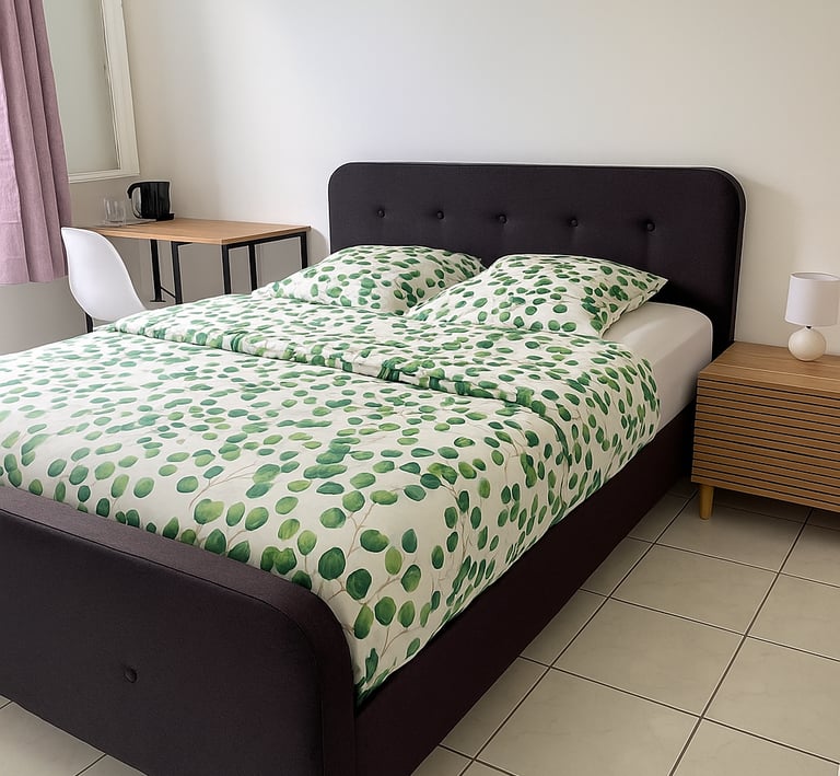 Chambre lumineuse côté colline avec lit queen-size, wifi, salle de bain, climatisation et parking privé.