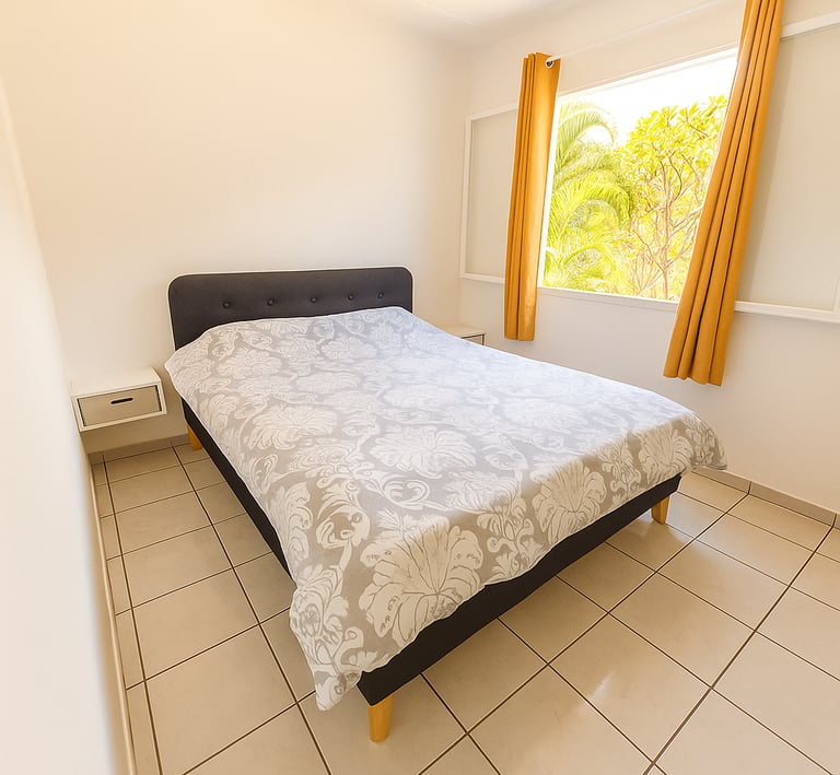 Chambre calme côté cour avec wifi, climatisation, salle de bain partagée avec "Frangipalmier" et parking privé inclus.